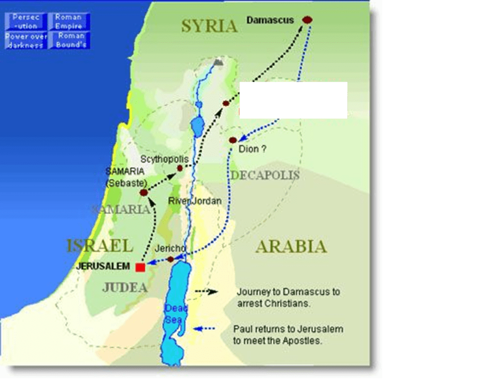 During the persecution in Jerusalem, the followers of Jesus Christ scattered, and many were found in Damascus. Saul hunted them down and traveled from Jerusalem to Damascus to arrest them. As seen on the map below, Jerusalem is seen towards the south, just west of the Dead Sea [Salt Sea] where the red square is. Damascus is towards the top of the mage, towards the east at the burgundy circle.