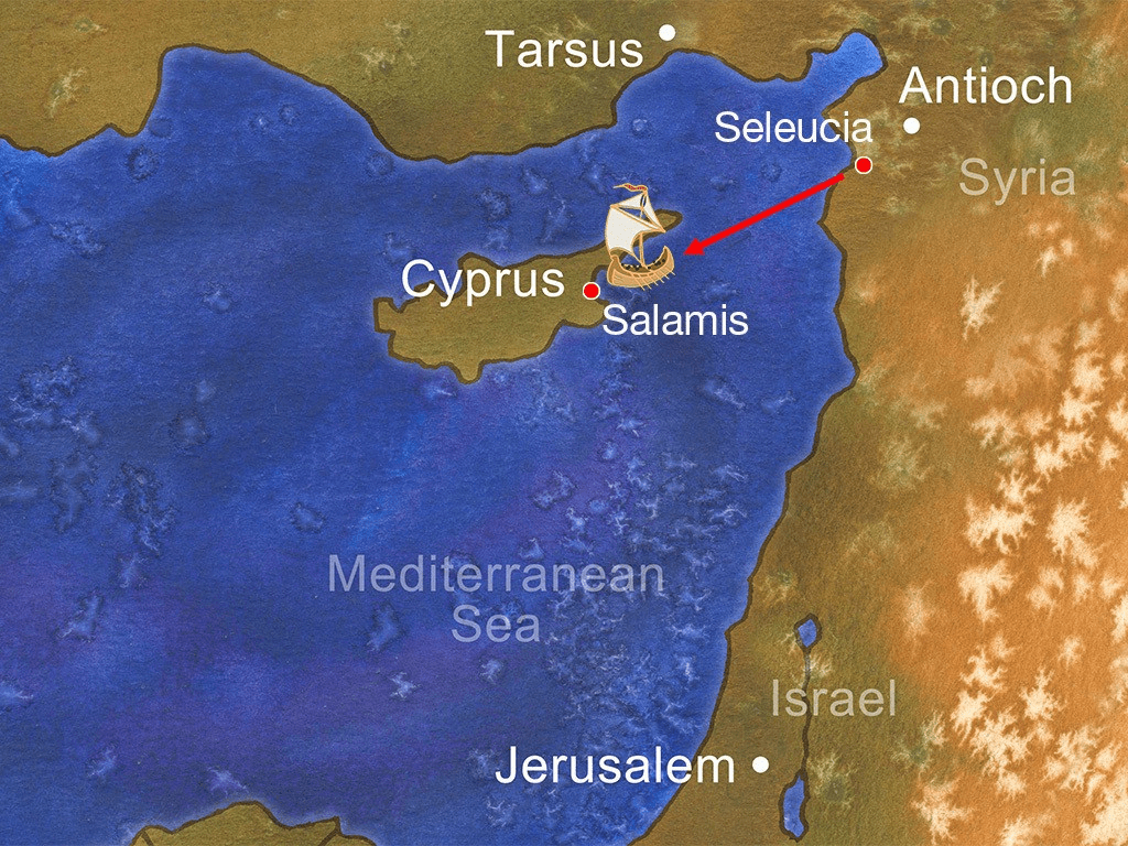 “They” refers to Paul and Barnabas [and Luke who recorded the events of Acts and wrote the Gospel of Luke]. Barnabas, who was from Cyprus, is also the one who sold his house to use the money to buy food and other necessities for those who left everything to follow Jesus Christ. as described in Act6s 4:36-37. This is also said about Barnabas, “For he was a good man, full of the Holy Spirit and of faith. And a great many people were added to the Lord.” Acts 11:24 In Antioch at Syria, Paul and Barnabas were chosen through the Holy Spirit for the missionary ministry, Acts 13:1-3. From that calling, they went to Seleucia, then sailed to Cyprus where there arrived in Salamis and preached the gospel of Jesus Christ to the Jewish people. Those places are seen on the map below.
