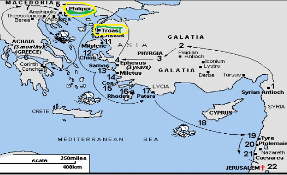 From Troas, Pul would be brought through several cities and then have a stay in Miletus.