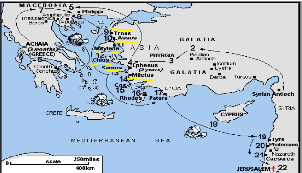 In the presence of James and the other leaders of the body of Jesus Christ Paul described in detail how God had worked among the Gentiles in the name of Jesus Christ. This would include his ministry in Cyprus, Antioch in Pisidia, Antioch in Syria, Iconium, Lystra, Derbe, Philippi, Thessalonica, Berea, Athens, Corinth, Ephesus, etc. All through the regions of Galatia, Asia, Phrygia, Macedonia, Greece, etc. Paul was bringing Jesus Christ to the non-Jewish Gentiles. The map below shows the area that Paul covered. The Holy Spirit was moving the testimony of Jesus Christ westward, which eventually reached the United States and all of the Americas.