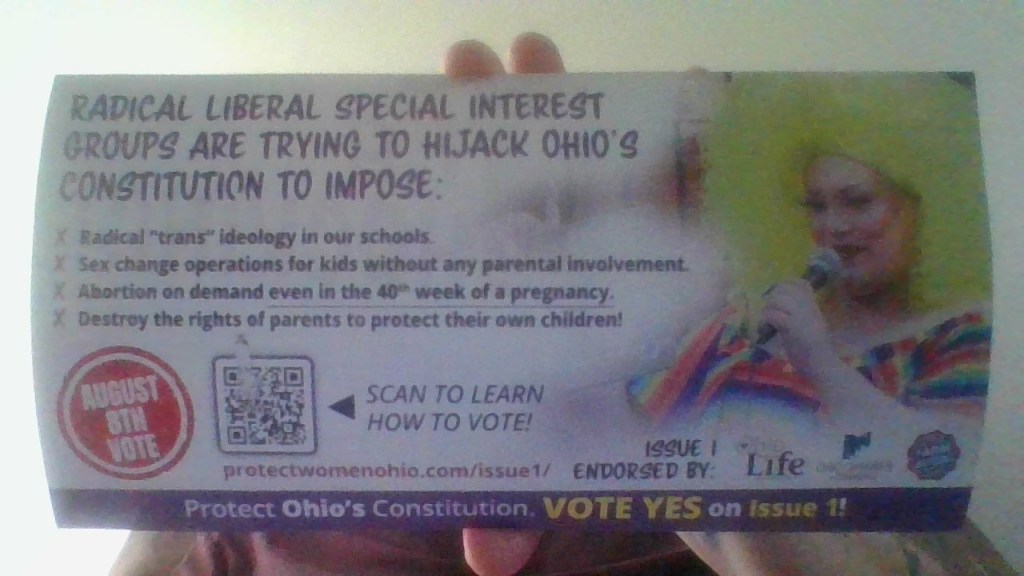The photo below is of a mailer I received in my mailbox today. It says to vote “Yes” on Issue 1 to raise the requirements to changing the constitution to a 60% majority. Everything they mention as a “minus” to keeping a 50 % plus 1 requirement to change the constitution is actually what they intend to implement with a 60% majority. Who are they lying to? They are lying to Christians, and everyone who opposes everything mentioned in the flyer. By cutting out the voice of the minority, they are cutting off those lifting up the Gospel of Christ. With a 60% majority requirement, they can completely discard the efforts of those on the narrow way attempting to pass a Christian law with only 50% plus 1 support.