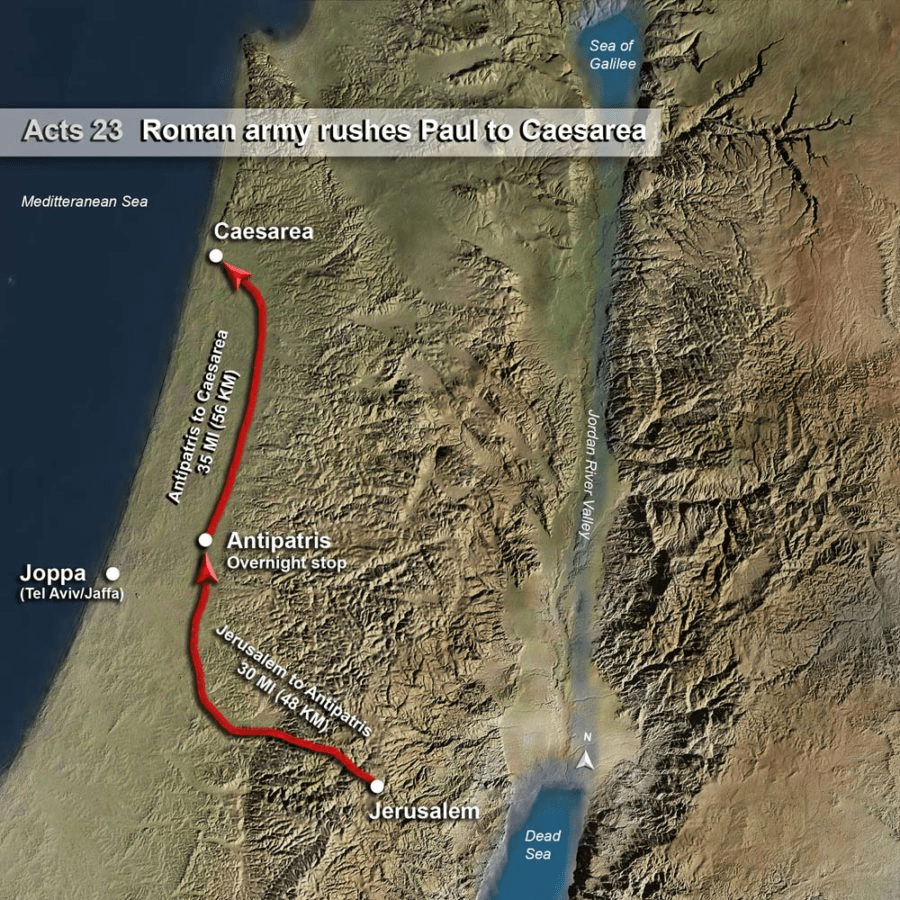 “Then the soldiers, as they were commanded, took Paul and brought him by night to Antipatris. The next day they left the horsemen to go on with him, and returned to the barracks. When they came to Caesarea and had delivered the letter to the governor, they also presented Paul to him. And when the governor had read it, he asked what province he was from. And when he understood that he was from Cilicia, he said, “I will hear you when your accusers also have come.” And he commanded him to be kept in Herod’s Praetorium.” Acts 23:31-35