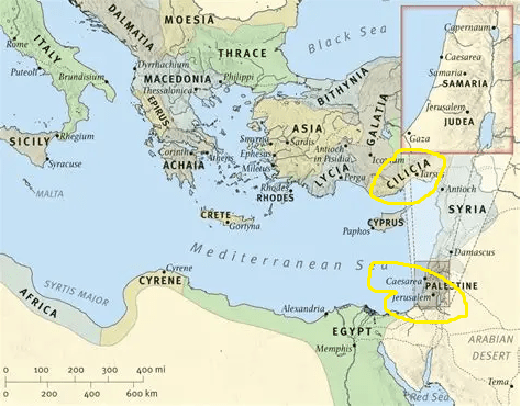 On the image below, Cilicia is seen in the top yellow circle, which is modern-day Turkey [also known as Tarsus]. That is the province where Paul is originally from, as quoted, “I am indeed a Jew, born in Tarsus of Cilicia…” Acts 22:3 In the yellow circle at the bottom is seen Caesarea, where Paul was sent to Governor Felix.