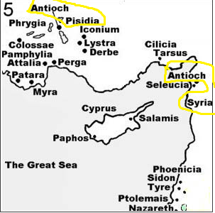 On the map below, Pamphylia is to the far left between Colossae and Attalia. That is where John Mark left Paul and Barnabas, Acts 13:13-14, and returned to Jerusalem. Paul and Barnabas are now at Antioch at Syria [Acts 14:26-35], which is to the far right in the picture and circled in yellow.