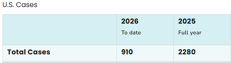 “Although the U.S. has maintained official measles elimination status since 2000, this status is currently at high risk of being lost due to a significant surge in cases and sustained, uncontrolled transmission, particularly following a major outbreak that began in Texas in 2025. The country recorded over 2,280 cases in 2025 and 910 cases as of mid-February 2026, marking the highest numbers since elimination…” quote from article.