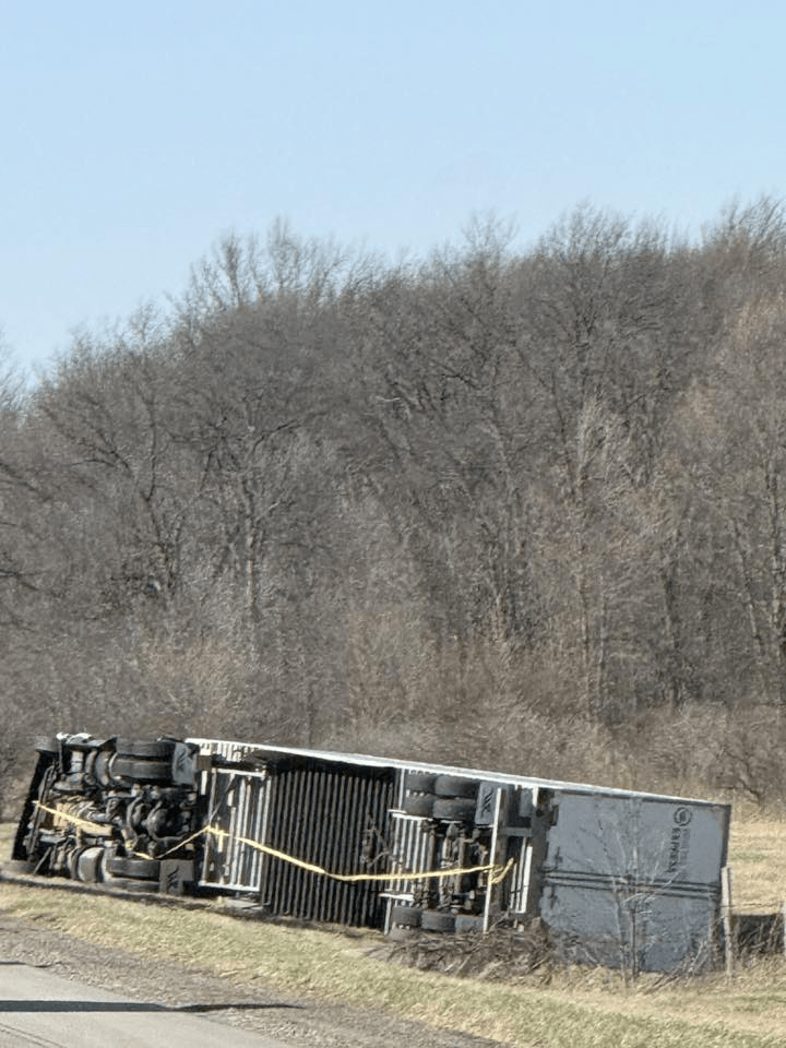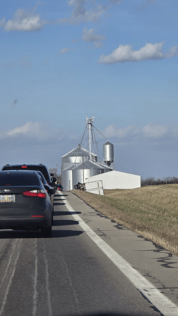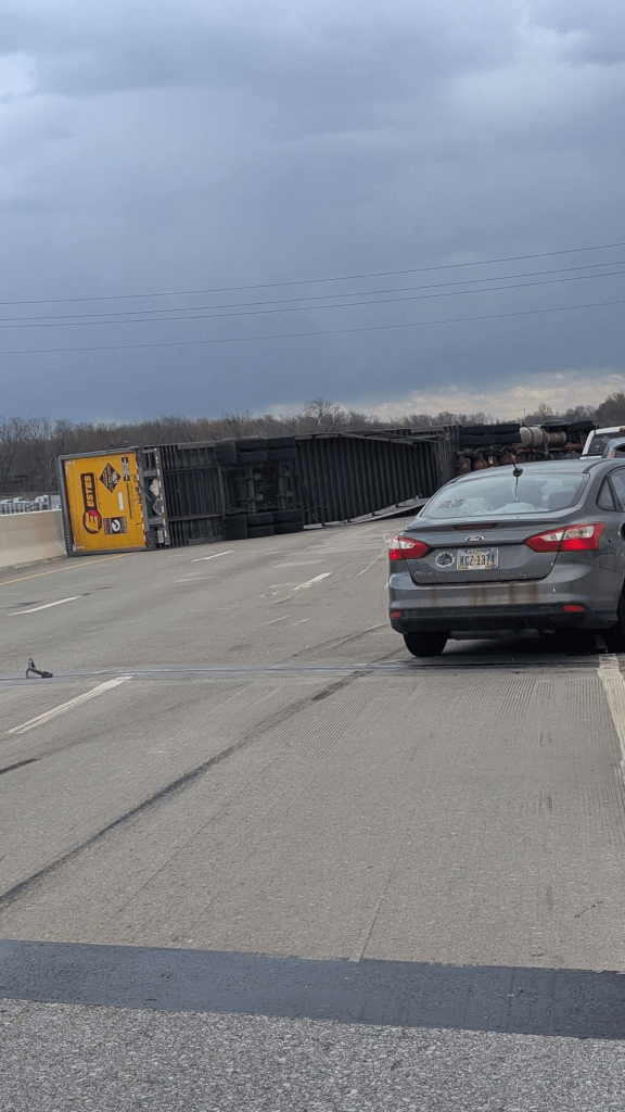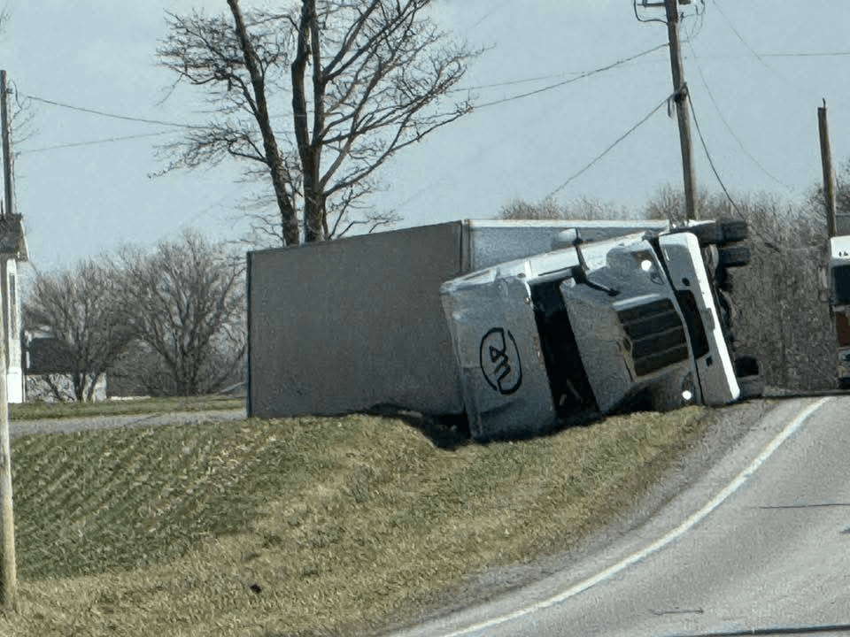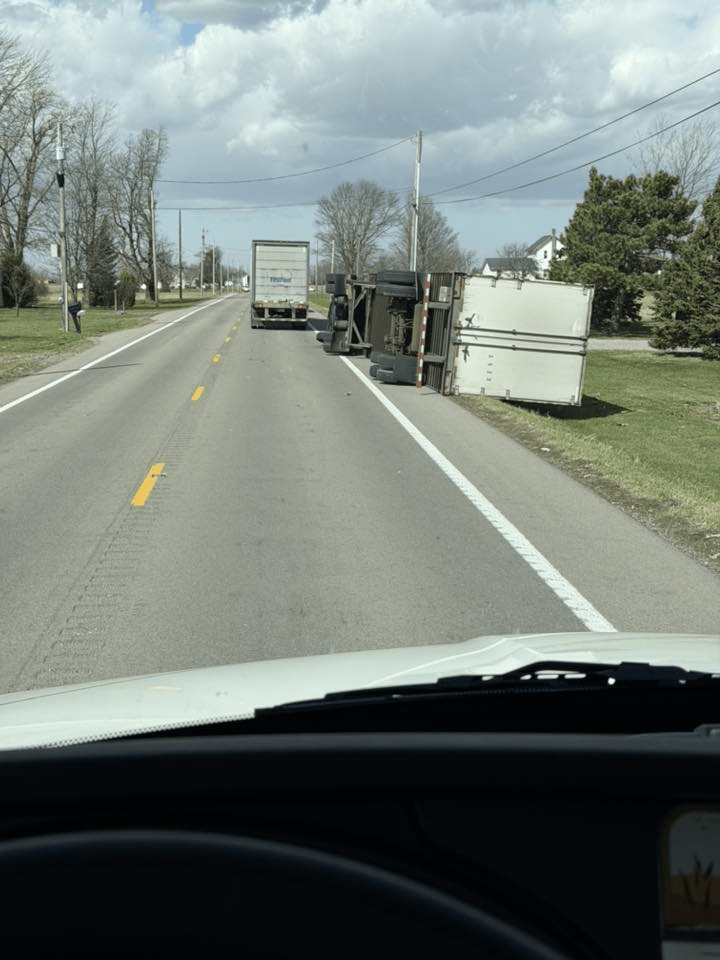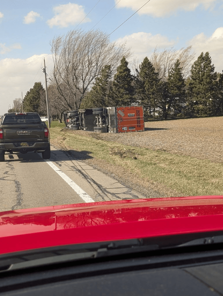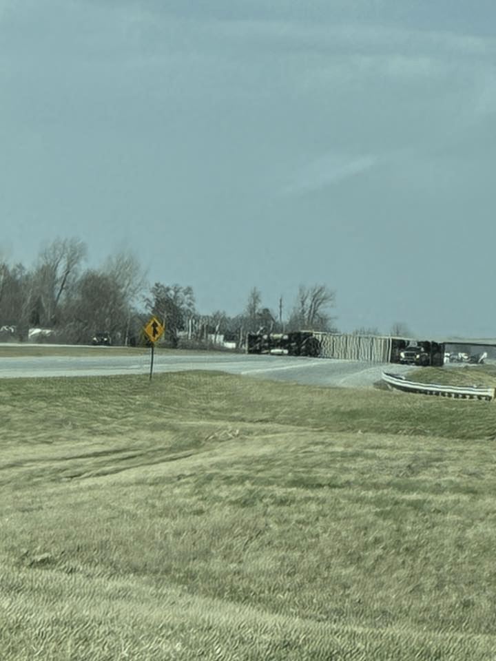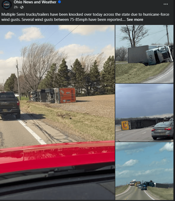 Here in Circleville, just today [March 13, 2026], semis are not able to travel because they are literally being blown off the road, as seen in the pictures below. Click the image below to see more tractor-trailers that were blown over by the wind today. There are also many, many road closures, big trees down, power lines down, power outages, damage to buildings, traffic lights out…