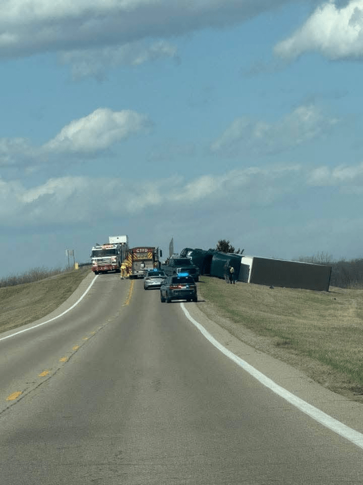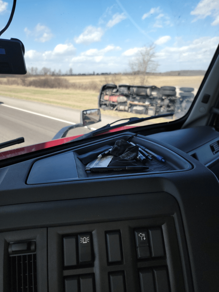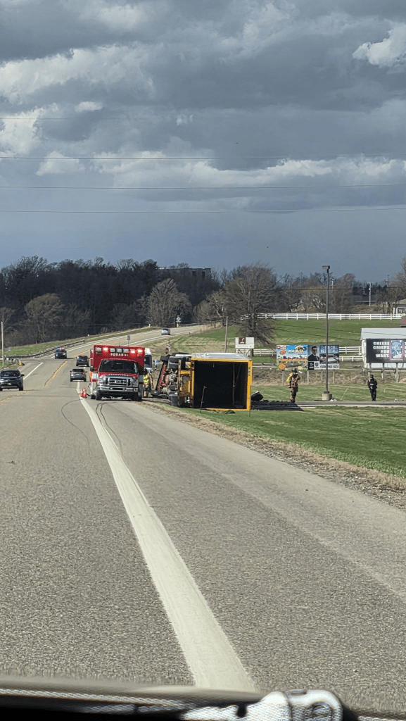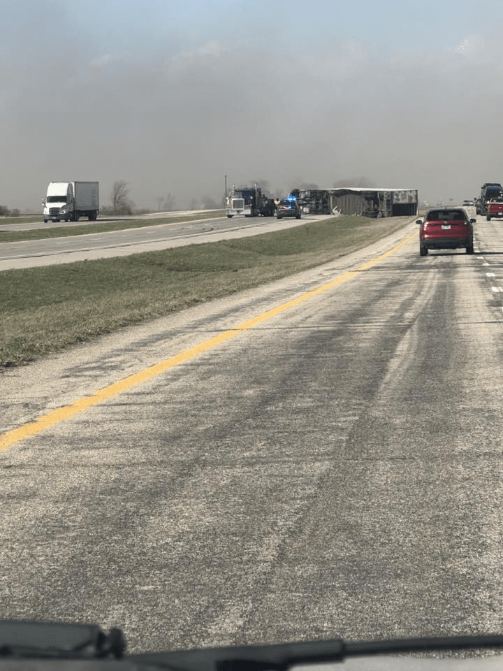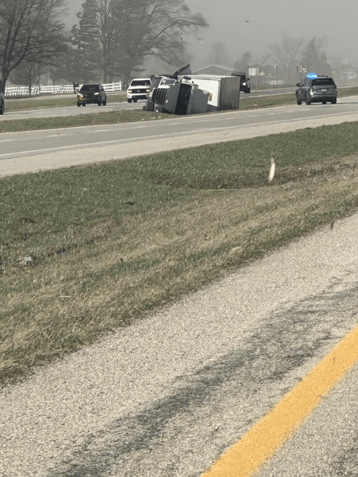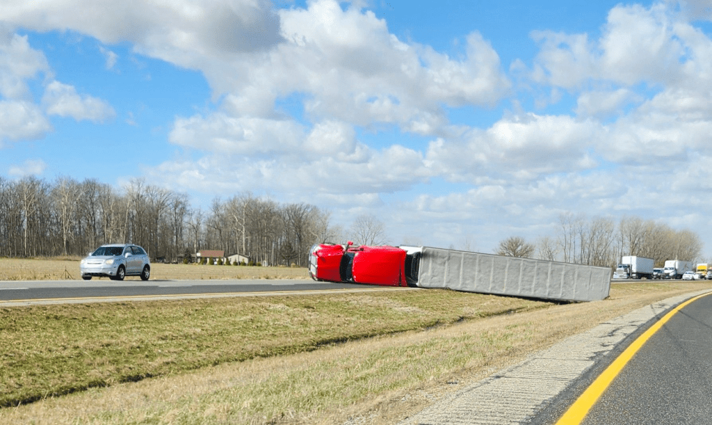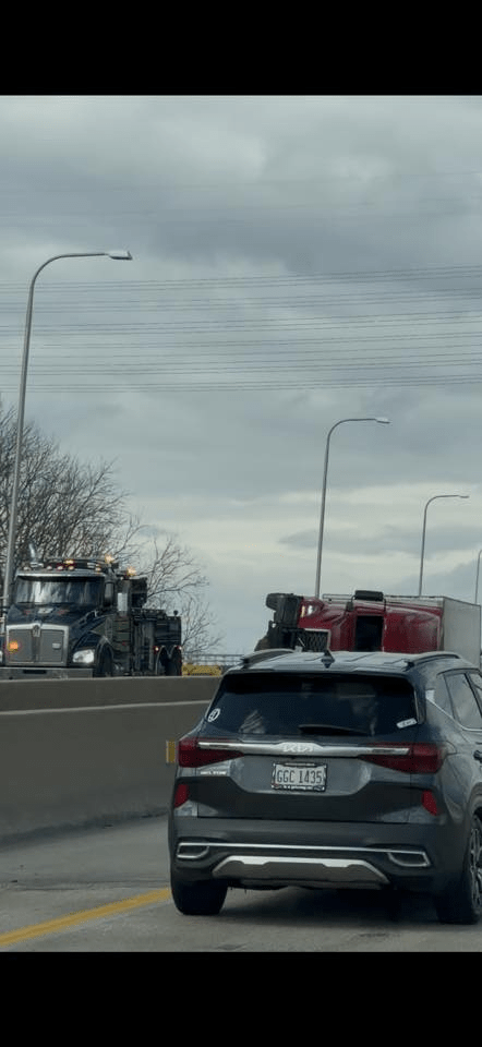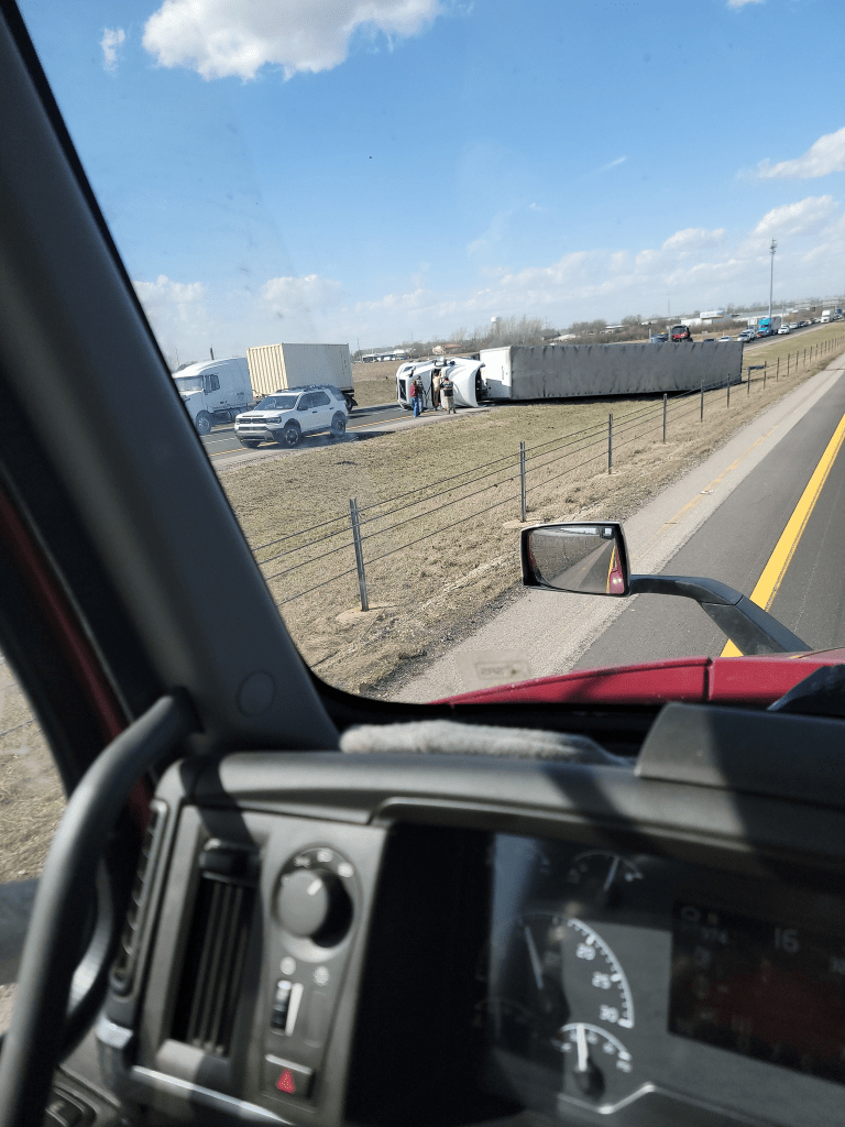 Here in Circleville, just today [March 13, 2026], semis are not able to travel because they are literally being blown off the road, as seen in the pictures below. Click the image below to see more tractor-trailers that were blown over by the wind today. There are also many, many road closures, big trees down, power lines down, power outages, damage to buildings, traffic lights out…