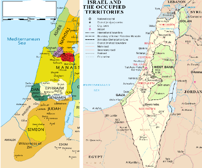 Today, Ephraim is in the upper territory of the West Bank, as seen by comparing the two maps below. The map to the right is the State of Israel of today and the map to the left is seen Ephraim and Manasseh. As we know, the conflict between the State of Israel with the West Bank is causing them to devour each other, to devour their own “brothers”. As spoken, “Every man will eat the flesh of his own arm.”